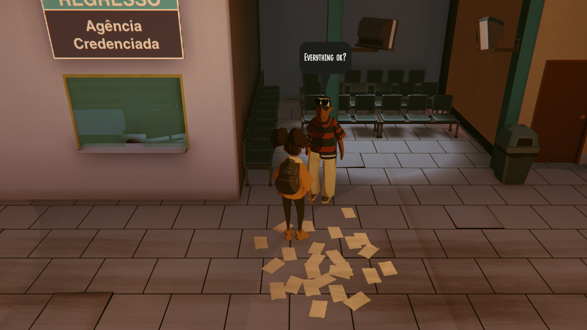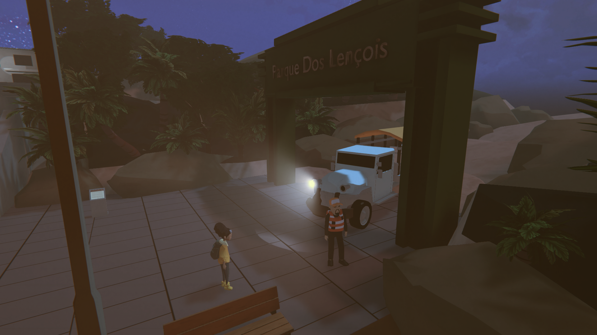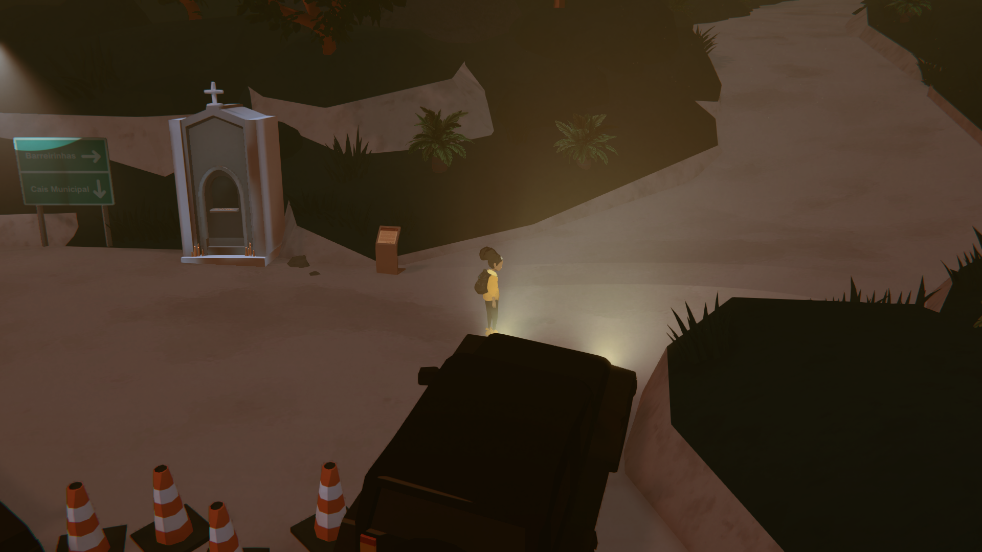 Using a compass that does not point north, the adventure begins upon arrival in the city of Lagoinhas, where you must explore the region and discover what happened to your sister in the middle of a desert. Bia find a strange compass and sets out to uncover the truth in a dark, mysterious town. By talking to locals, she gathers clues to decide her path. Guided by the mysterious compass, she explores a desert of oasis, solving puzzles across diverse environments, until she discovers the truth. In the heart of the desert, every choice is a crossroads, shaping your journey and deciding the future of the ones you love.